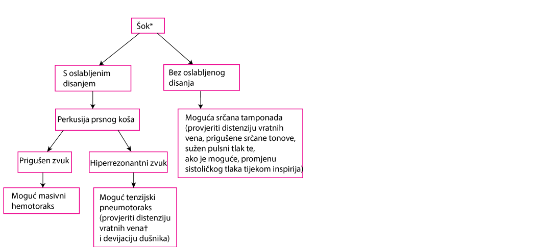 Pojednostavljena, brza procjena bolesnika s traumom prsnog koša i šokom tijekom prvog pregleda * krvarenje treba isključiti kod svih bolesnika koji razviju šok nakon velike traume, bez obzira da li se utvrdi točna ozljeda prsnog koša koja bi mogla izazvati šok. †distenzija vratnih vena može biti odsutna kod bolesnika koji su hipovolemičnom šoku. |
