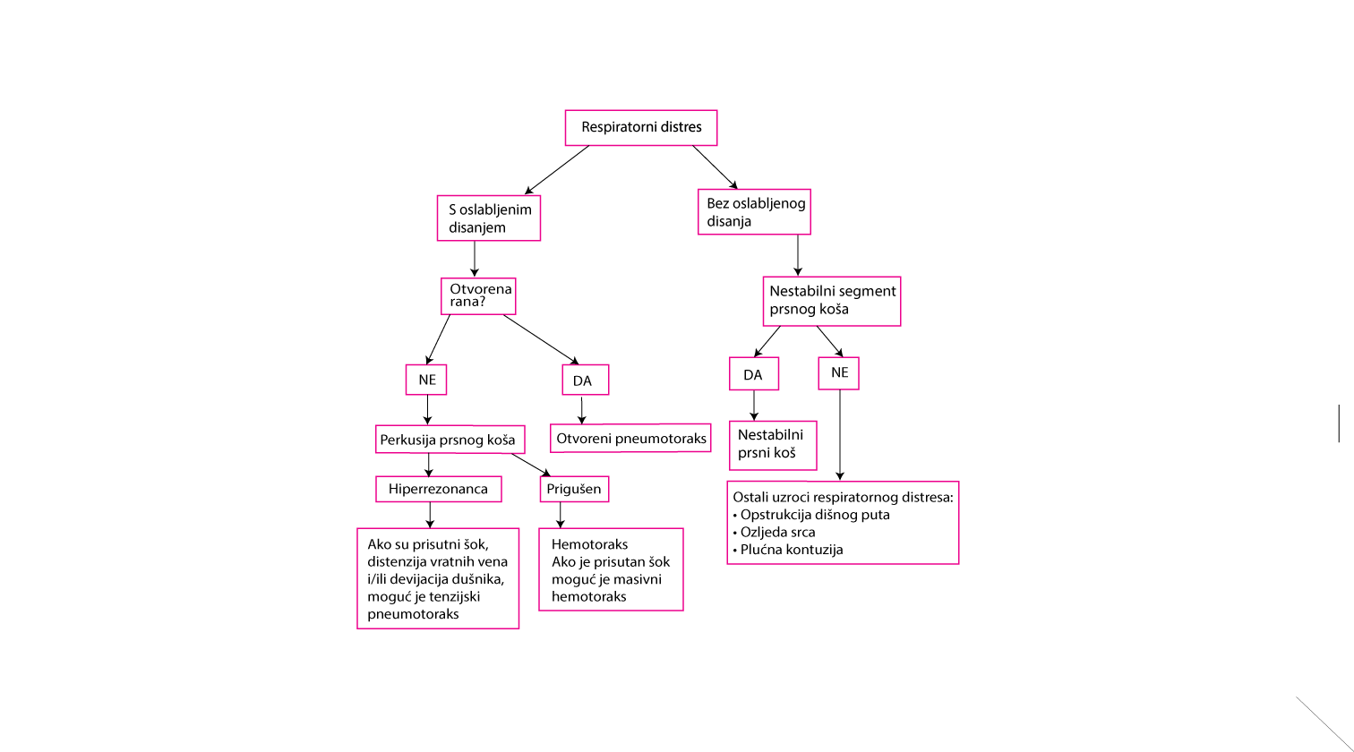 Pojednostavljena, brza procjena bolesnika s torakalnom traumom i respiratornim distresom tijekom prvog pregleda Kod bolesnika s torakalnom traumom i poremećenom cirkulacijom (prisutni znakovi šoka), teške ozljede koje treba uzeti u obzir tijekom prvog pregleda uključuju sljedeće: