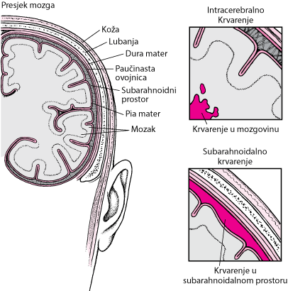 Kada su krvne žile u mozgu slabe, abnormalne ili pod neuobičajenim tlakom, može doći do hemoragijskog moždanog udara. Kod hemoragijskih moždanih udara može doći do krvarenja unutar mozga - intracerebralno krvarenje. Može doći do krvarenja između unutarnjeg i srednjeg sloja tkiva koje pokriva mozak (u subarahnoidalnom prostoru), kao subarahnoidalno krvarenje.